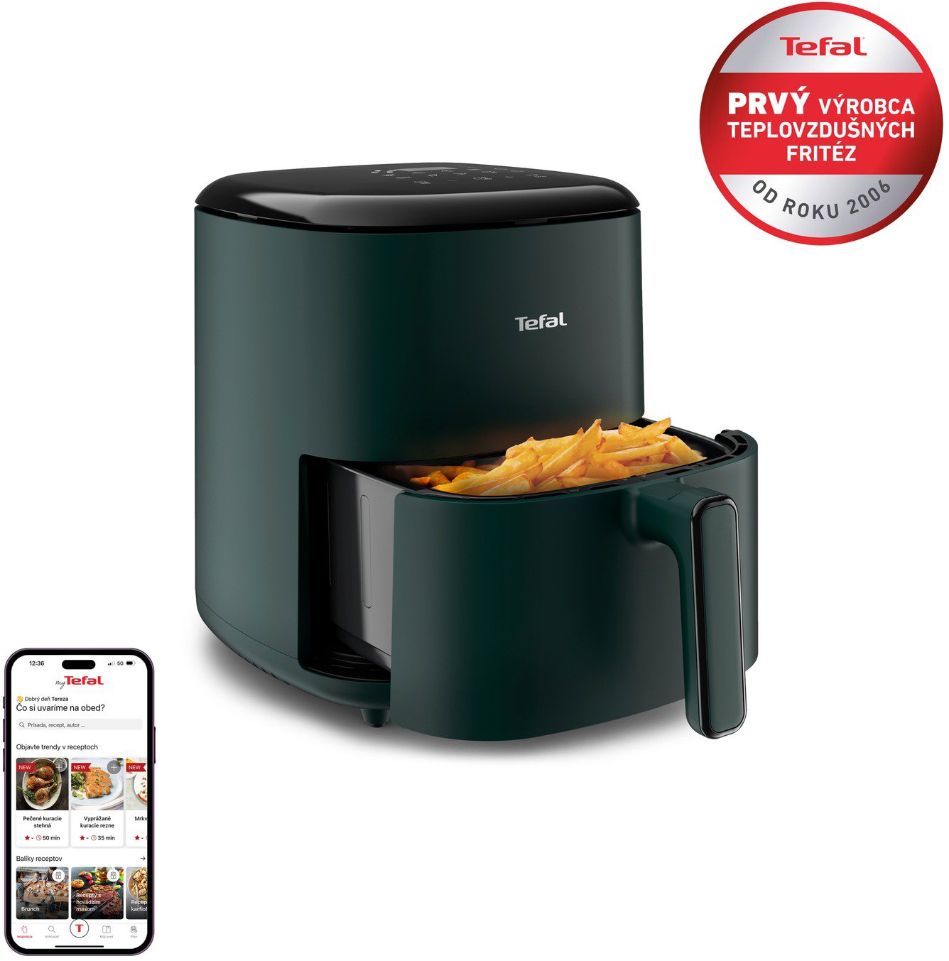 Teplovzdušná fritéza – objem 5 litrov, príkon 1500 W, 10 prednastavených programov (hranolky, kura, steak, ryby, dezert, pizza, nugety, zelenina, krevety a slanina), jedlo až pre 6 osôb, intuitívna digitálna obrazovka, My Tefal aplikácia, ľahké…