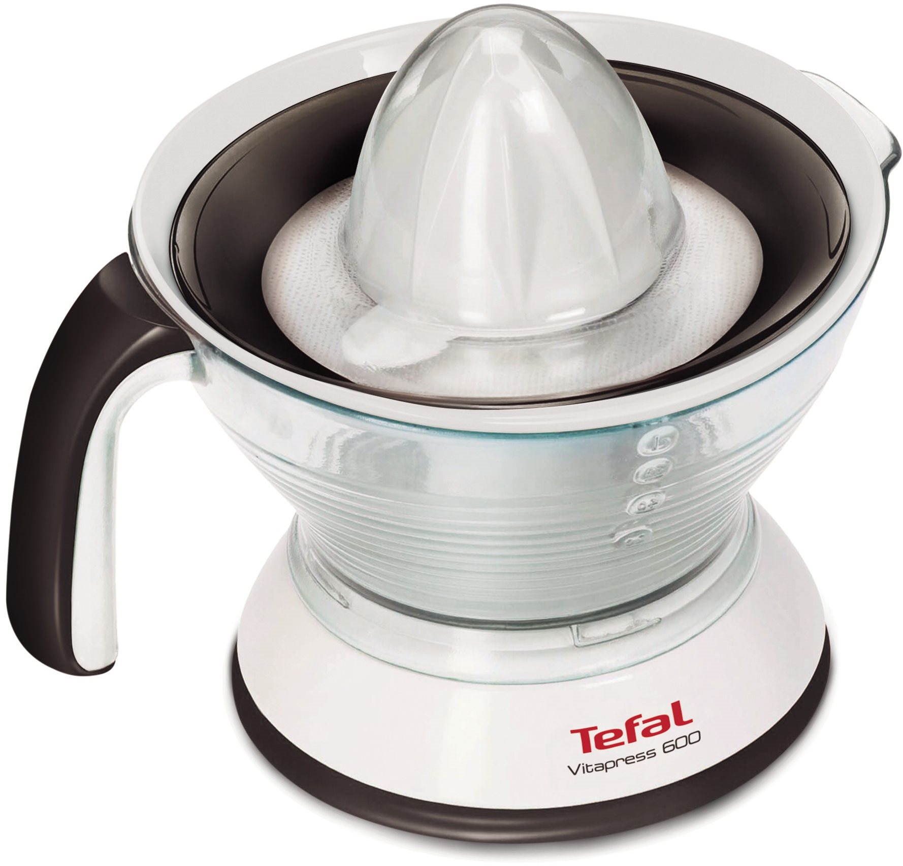 Odšťavovač – s príkonom 25W, objem nádobky na šťavu 0.6l, počet lisovacích kužeľov 1, antikorový filter, plastová nádoba na šťavu, odnímateľné časti vhodné do umývačky, obojstranná rotácia, 15-ročná záruka opraviteľnosti Select brand: ÚvodHlavné informácieGalériaTechnická špecifikáciaLis na citrusy elektrický Tefal Vitapress ZP300138Odšťavovač Vitapress značky Tefal poskytuje efektívne lisovanie šťavy pomarančov, citr