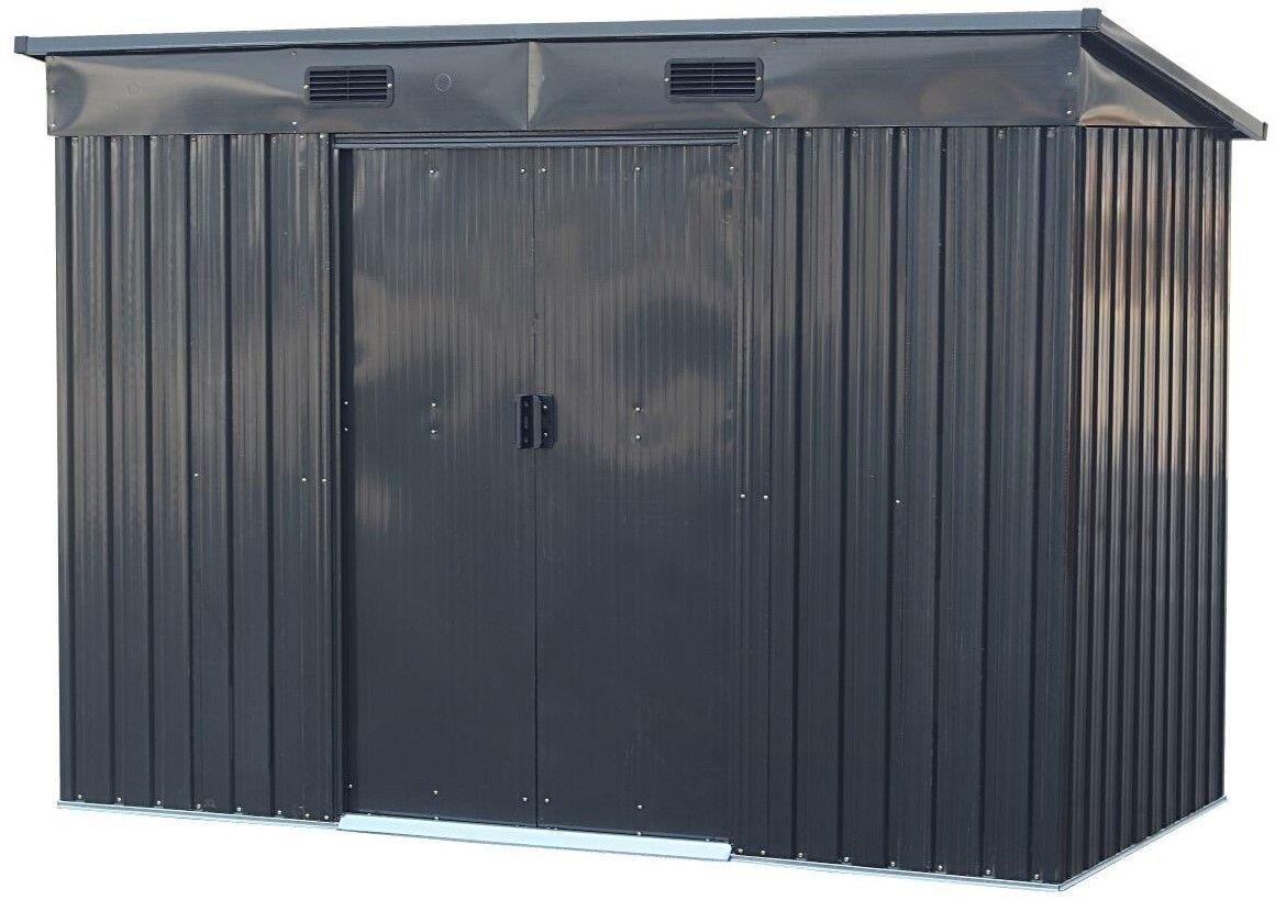 Záhradný domček – oceľový, plechové opláštenie, s pultovou strechou, posuvné dvere, s prípravou na visiaci zámok, vo výbave pasívna ventilácia, plocha 2,7 m², rozmery 181 × 249,6 × 112,1 cm (V׊×H), sivá farba Záhradný domček…