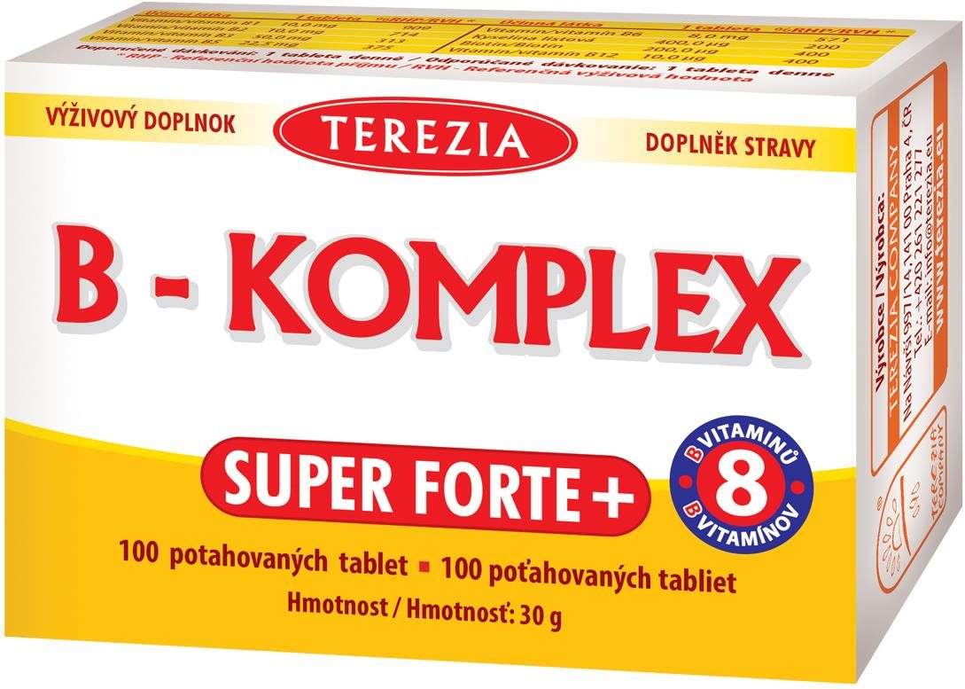 B-komplex – vitamíny B podporujú energetický metabolizmus, činnosť nervovej sústavy, prispievajú k normálnemu stavu pokožky a slizníc TEREZIA B-Komplex Super Forte100 tablietKaždá tableta obsahuje všetkých 8 vitamínov skupiny B, teda vitamíny B1, B2, B3, B5, B6, B7, B9 a B12 vo vysokých dávkach. Spoločne tieto vitamíny podporujú ene