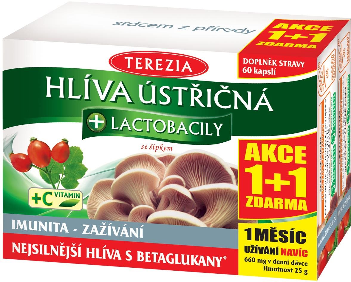 Hliva ustricová – kombinácia hlivy ustricovej (250 mg) s deklarovaným obsahom betaglukánu (118,2 ±3,75 mg), vitamínu C (40 mg) a extraktu zo šípok (20 mg) v 1 kapsule, 3 probiotické kmene s deklarovaným obsahom CFU, 60+60 kapsúl TEREZIA Hliva + lactobacily60 + 60 kapsúlHliva ustricová obsahuje široké spektrum biologicky aktívnych látok – betaglukány, hubovú vlákninu a ďalšie. Vitamín C podporuje funkciu imunitného a nervového