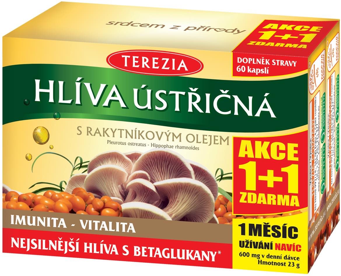 Hliva ustricová – zmes 100% prášku hlivy ustricovej a 100% rakytníkového oleja bez prímesí (celkom 300 mg), s účinnou látkou betaglukán (118,2 ±3,75 mg) v 1 kapsule, obsahuje širokú škálu biologicky aktívnych látok, 60+60 kapsúl TEREZIA Hliva s rakytníkovým olejom60 + 60 kapsúlHliva ustricová obsahuje široké spektrum biologicky aktívnych látok – betaglukány, hubovú vlákninu a ďalšie. Rakytníkový olej je najvzácnejšou látkou z