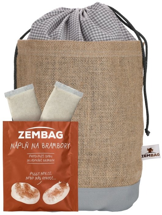 Vrece na zemiaky – obsiahne 5 kg, sťahovacie, priedušné a svetlo nepriepustné, materiál juta, bavlna a netkaná textília, rozmery 30 × 20 cm (výška × priemer), rascové vrecúško v balení, sivá farba Vrece na zemiaky Terpenix Zembag je praktickým a ekologickým riešením na uskladnenie zemiakov. Toto sivé vrece je vyrobené z kvalitnej kombinácie juty, bavlny a netkanej textílie, čo zaisťuje priedušn