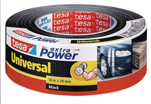 Lepiaca páska – duct tape, textilná, návin 50 m, šírka 50 mm, vhodná na kov, papier, drevo a textil, odtrhnuteľná rukou, čierna farba Kľúčové vlastnosti lepiacej pásky tesa Extra Power Universal, textilná, čierna, 50 m : 50 mm Lepiaca páska TESA zlepí kov, papier, drevo a textil Duct tape páska obsahuje výstuž z vlákien, vďaka čomu