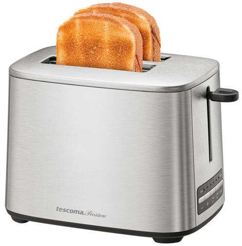 Hriankovač – na 2 hrianky, regulácia opekania, rozmrazovanie, tlačidlo okamžitého ukončenia a automatické vypnutie, súčasťou vyberateľná miska na omrvinky, príkon 1000 W, materiál antikoro, plast a kov, Prvotriedny domáci hriankovač TESCOMA PRESIDENT s nadštandardnými programami a funkciami. Ľahko a rýchlo v ňom pripravíte dokonale opečené toasty z bieleho aj celozrnného chleba v 6 stupňoch intenzity