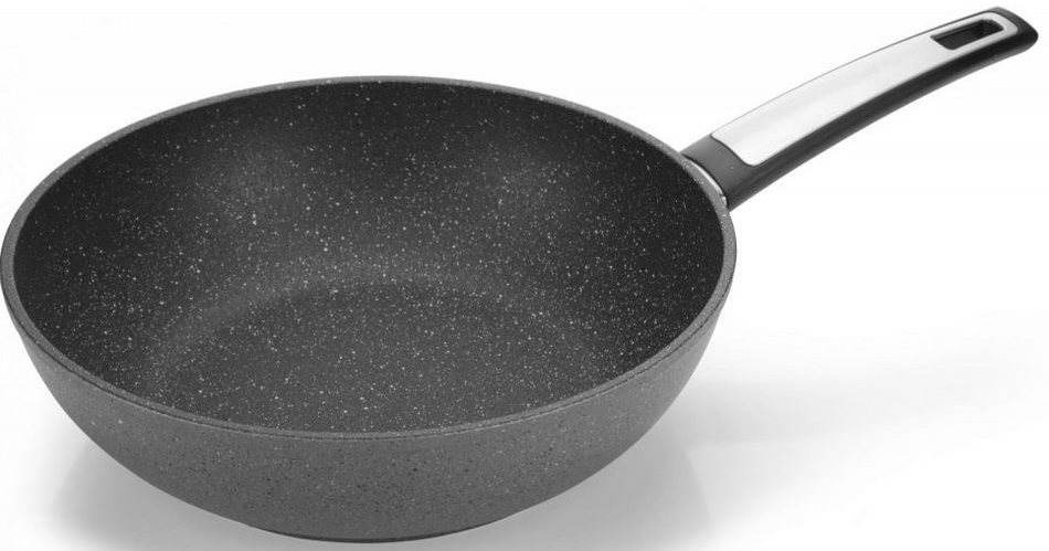 Wok panvica – hliníková, okrúhla, vhodná na elektrickú, plynovú, sklokeramickú aj indukčnú varnú dosku, možnosť umývania v umývačke a nepriľnavý povrch, ergonomická, hrubé dno, výška 8 cm, priemer horného okraja 28 cm, vonkajší priemer dna panvice 19 cm, čierna farba Chcete mať istotu, že nepripálite žiadny pokrm? Kúpte si Wok Tescoma i-PREMIUM Stone, panvu pre skúsených kuchárov aj začiatočníkov. Unikátne zvrásnený antiadhézny povlak má charakter nelešt