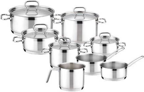 Sada riadu na varenie – na plynovú, elektrickú, indukčnú a sklokeramickú varnú dosku, 7 hrncov v súprave, ergonomická rukoväť, možnosť použitia neostrého kovového náčinia, použitie v rúre a možnosť umývania v umývačke, telo tvorí nehrdzavejúca oceľ, antikorový vonkajší povrch hrnca, antikorový vnútorný povrch hrnca, antikorová rukoväť hrnca, pokrievka v balení, strieborná farba Trinásťdielna sada riadu HOME PROFI predstavuje prémiovú výbavu pre každú domácnosť – dva hrnce a tri kastróly s pokrievkami, dve rajnice bez pokrievky a jednoduchý mliekarník. To všetko v prvotriedno