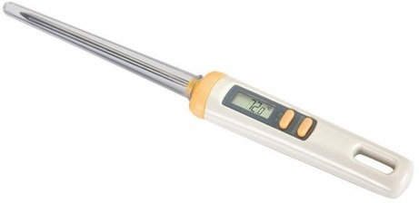 Kuchynský teplomer – digitálny, určený na pečenie a na varenie, výber jednotiek °C/°F, batéria súčasťou balenia, minimálna teplota -50 °C, maximálna teplota 300 °C V kuchyni občas nastane situácia, kedy potrebujete zmerať teplotu pripravovaných či ohrievaných pokrmov. Na presné a rýchle zmeranie teploty vo vnútri omáčok, mäsa, nápojov a pod. je určený di