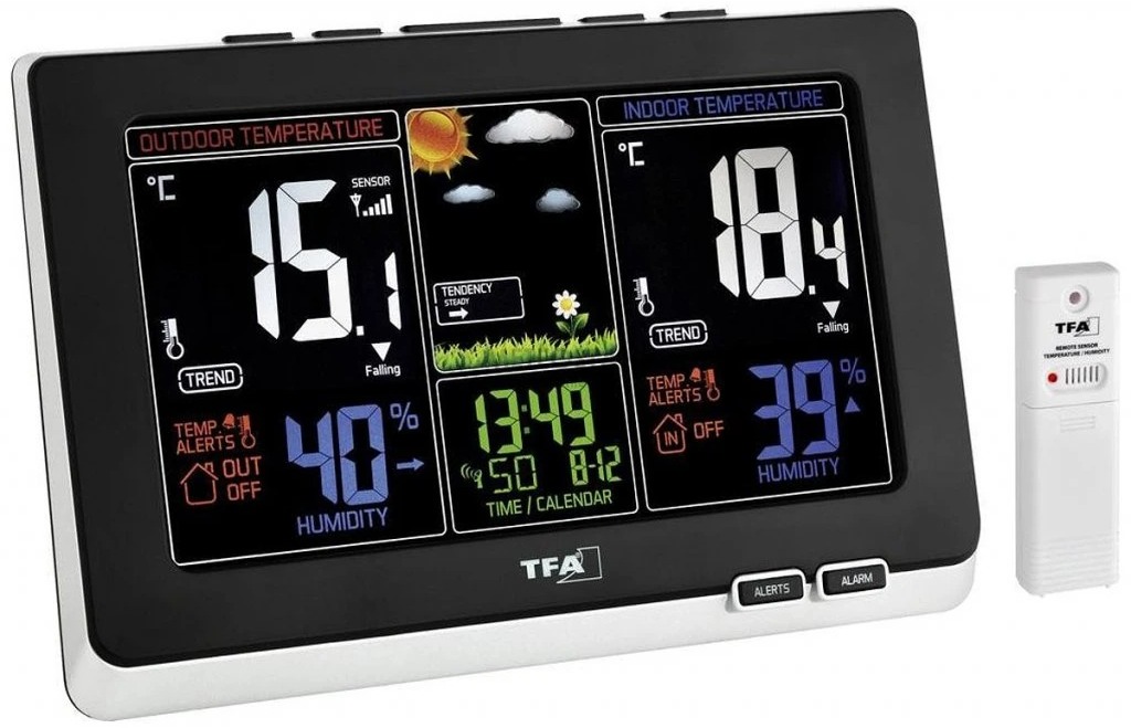 Meteostanica – domáca, bezdrôtová, pripojenie cez rádiové vlny, vnútorná a vonkajšia, s predpoveďou a sledovaním aktuálneho počasia, budík, meranie barometrického tlaku, rosného bodu, teploty, vlhkosti, zobrazuje čas a dátum, dosah bezdrôtového snímača 60 m, maximálne možno pripojiť 1 bezdrôtový snímač, uzatvorený systém, využitie samostatne, do siete aj na batérie, hlavná jednotka, snímač a napájací adaptér súčasťou balenia, umiestnenie na stenu a na stôl, rozmery 140 × 210 × 26 mm (V׊×H) Meteostanica TFA 35.1129.01 Spring zobrazuje vonkajšiu aj vnútornú teplotu, vlhkosť aj atmosférický tlak. Vonkajšiu teplotu meria v rozsahu -40 až 60 °C, vnútornú potom od 0 do 50 °C. Vlhkosť identif
