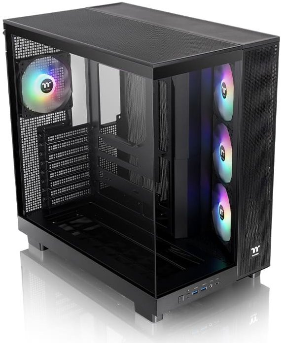 PC skrinka – ATX, mATX (Micro ATX) a mITX (Mini ITX), 2× 2,5″, 1× 2.5″/3.5″, Konektory predného panelu USB 3.2 Gen 1, USB-C, 3,5 mm Jack (mikrofón/slúchadlá) a USB 3.2 Gen 2, počet predinštalovaných ventilátorov 4× 120 mm, max. výška chladiča 160 mm, max. dĺžka grafickej karty 420 mm, bez zdroja, materiál bočnice temperované sklo, ARGB farba podsvietenia PC skrinka THERMALTAKE View 380 XL TG ARGB Black vo formáte Midi Tower ponúka pútavé vyhotovenie, ktorému dominuje čierna farba. Tá je využitá na oceľovej konštrukcii. Formát Midi Tower je prísľubom n