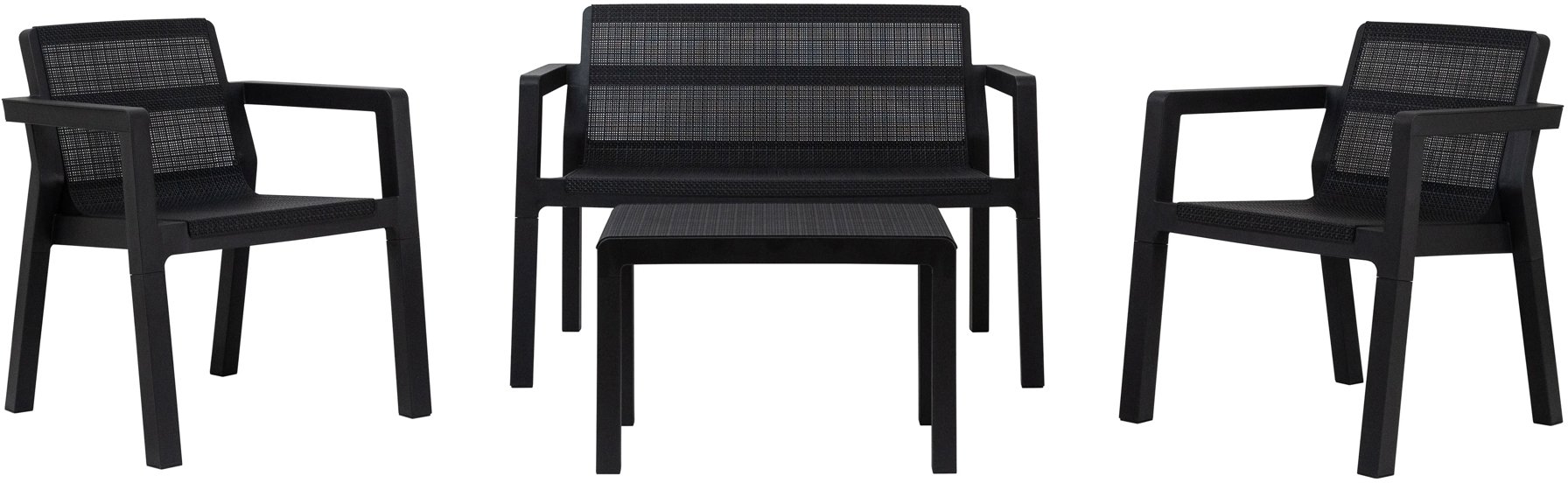 Záhradný nábytok – zostava, 2 stoličky, nosnosť 110 kg, 1 lavice, nosnosť 220 kg, stôl štvorec, rozmer 43 cm × 43 cm × 42 cm, materiál dosky stola plast, materiál sedadla/opierky chrbta lavice plast Záhradný nábytok Toomax Riviera z lisovaného plastu v dizajne inšpirovaným pletenou jutou. Súprava sa skladá z dvoch pohodlných kresiel, sofa a praktického stolíka, čo vytvára ideálny priestor na pose