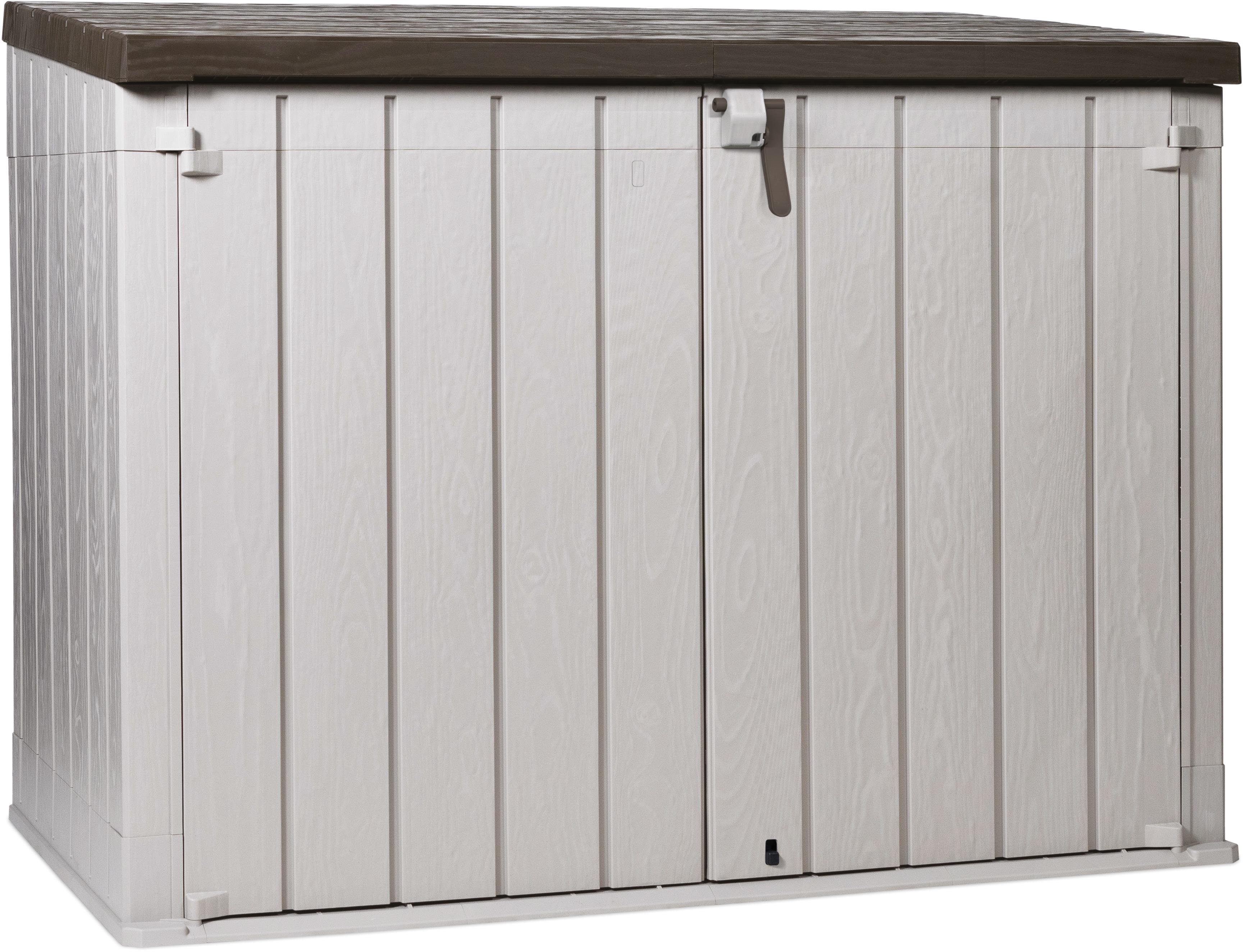 Záhradná skrinka – plastová, uzamykateľná, odolná proti UV a vodoodolná, rozmery 140 × 178 × 109 cm (V׊×H), hmotnosť 51 kg, hnedá a béžová farba Plastová záhradná skrinka TOOMAX je ideálna na uskladnenie náradia, pomôcok do záhrady a rôznych čistiacich prostriedkov. Je možné ju uzamknúť, čo zaručí bezpečnú ochranu obsahu. Materiál je UV stabil