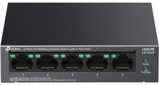 Switch domáci – desktop, unmanaged, 5× RJ-45, 5× 10/100Base-T, auto-negotiation, plug and play a PoE, QoS (Quality of Service), extended mode a PoE Auto recovery, podporuje 802.3af (PoE) a 802.3at (PoE+), 4 PoE vstupy (PoE budget 41 W), prepínacia kapacita 1 Gb/s, 5 portov s rýchlosťou 100 Mbit, prevádzková teplota od 0 do 40 °C, rozmery 25,1 × 99,8 × 98 mm (V׊×H) Sieťový prepínač je aktívny sieťový komponent, ktorý prepája jednotlivé zariadenia prípadne ďalšie sieťové prvky. Funguje na koordináciu sieťovej prevádzky. TP-Link LS105LP je vhodný na umiestnenie na