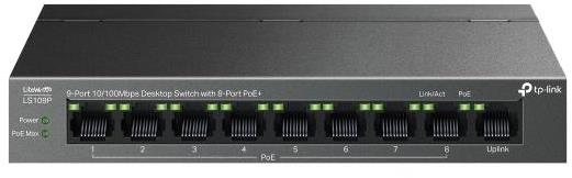 Switch domáci – desktop, unmanaged, 9× RJ-45, 9× 10/100Base-T, auto-negotiation, plug and play a PoE, QoS (Quality of Service), extended mode, isolation mode a PoE Auto recovery, statický routing, podporuje 802.3af (PoE) a 802.3at (PoE+), 8 PoE vstupov (PoE budget 63 W), prepínacia kapacita 1,8 Gb/s, 9 portov s rýchlosťou 100 Mbit, prevádzková teplota od 0 do 40 °C, rozmery 27 × 171 × 98 mm (V׊×H) Sieťový prepínač je funkčný sieťový prvok, ktorý prepája zariadenia alebo ďalšie prvky siete. Funguje na zapojenie sieťovej prevádzky. TP-Link LS109P je určený na umiestnenie na stolnú dosku alebo zav