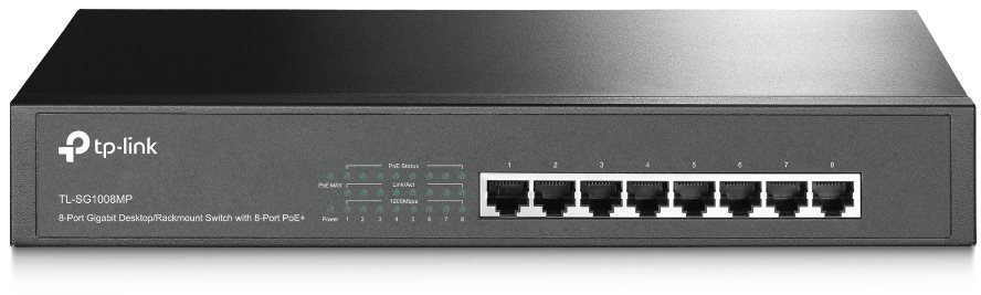 Switch firemný – desktop, unmanaged, 8× RJ-45, 8× 10/100/1000Base-T, IGMP, Auto-MDI/MDIX, auto-negotiation a PoE, extended mode a PoE Auto recovery, podporuje 802.3af (PoE) a 802.3at (PoE+), 8 PoE vstupov (PoE budget 126 W), prepínacia kapacita 0,128 Gb/s, 8 portov s rýchlosťou 1 Gbit, prevádzková teplota od 0 do 50 °C, rozmery 44 × 294 × 180 mm (V׊×H) Prepínač čiže switch je funkčný sieťový komponent prepájajúci koncové zariadenia prípadne ďalšie sieťové prvky. Slúži na koordináciu sieťovej prevádzky. TP-LINK TL-SG1008MP je vhodný na umiestnenie na