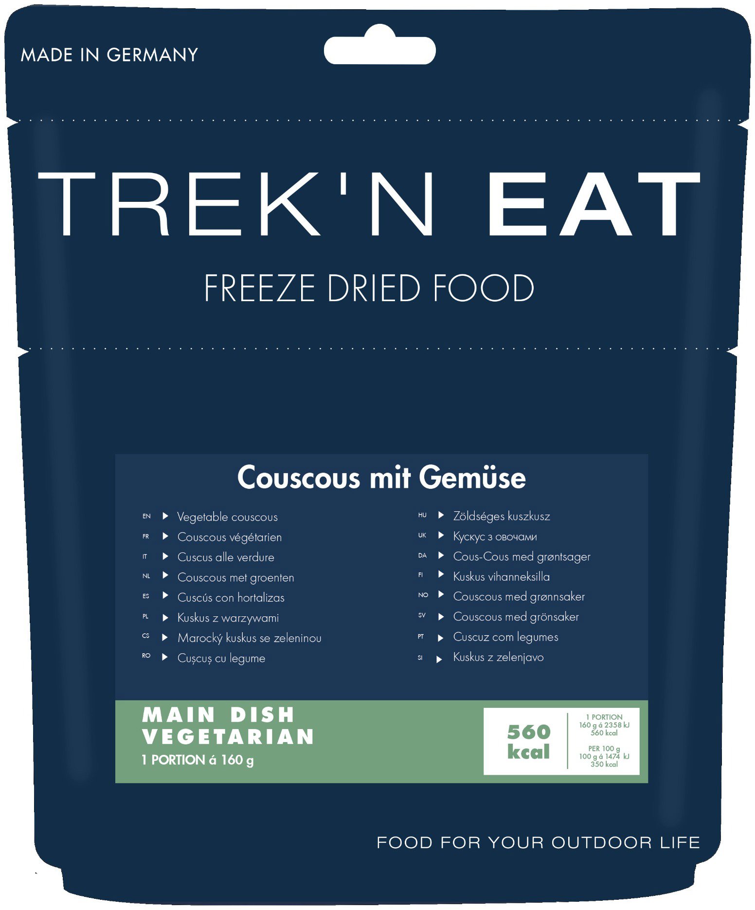 MRE – Meal Ready To Eat, hlavné jedlo, energetická hodnota na 100 g 1465,38 kJ, príloha kuskus, alergény zeler a výrobky z neho, mlieko a výrobky z neho a obilniny obsahujúce lepok (pšenica, raž, jačmeň, ovos, špalda), dehydratované jedlo, ohrev zmiešaním s horúcou vodou, 1 porcie, hmotnosť 160 g Trek’n eatMarocký kuskus so zeleninou, 160 gSeveroafrické potešenie a osviežujúca vegetariánska kuchyňa – nový kuskus so zeleninou je perfektnou kombináciou pre každého, kto sa chce na cestách posilni