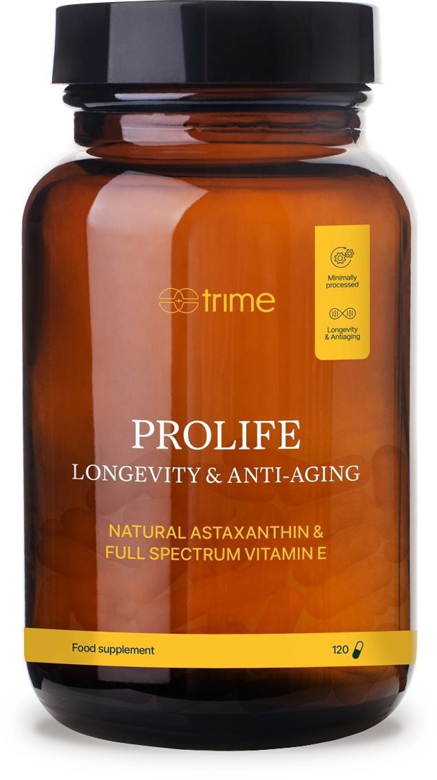 Doplnok stravy – kombinácia bio astaxantínu z riasy Haematococcus pluvialis (4 mg), vitamínu E vo forme d-alfa tokoferolu (4,4 mg) a zmesi tokotrienolov (19 mg) v 1 kapsule, plnospektrálna forma vitamínu E z palmových plodov, vegan, 120 kapsúl Trime ProLife, 120 kapsúlUnikátna dvojzložková antioxidačná zmes s obsahom plnospektrálneho prírodného vitamínu E (zmes tokoferolov a tokotrienolov) a cenného bio Astaxantínu z riasy. Voľné radikály s