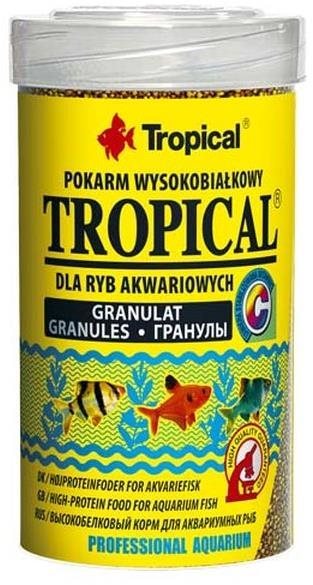 Krmivo pre akváriové ryby – kompletné krmivo, typom krmiva sú granuly, určené pre akváriové ryby, jazerné ryby, morské ryby a poter, hmotnosť 0,05 kg, objem 0,1 l, s vysokým obsahom proteínov Tropical Tropical granulát predstavuje krmivo vo forme potápajúcich sa granúl vhodné na denné kŕmenie všežravých a mäsožravých akváriových rýb. Podávať ho možno aj rybám v priebehu trenia a mladým ryb