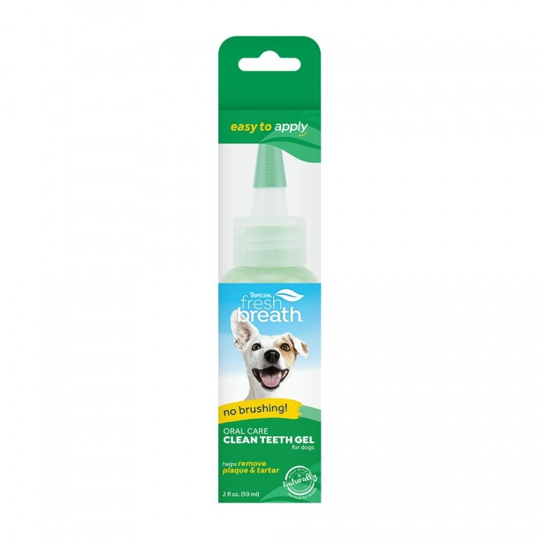 Prostriedok na zuby – pre psov, gél ošetrujúci ústnu dutinu bez použitia zubnej kefky, objem: 59ml Čistiaci gél na zuby TropiClean Fresh Breath predstavuje jednoduché a účinné riešenie pre každodennú starostlivosť o zuby psov aj mačiek. Ihneď po aplikácii začína pôsobiť proti zubnému povlaku a kame