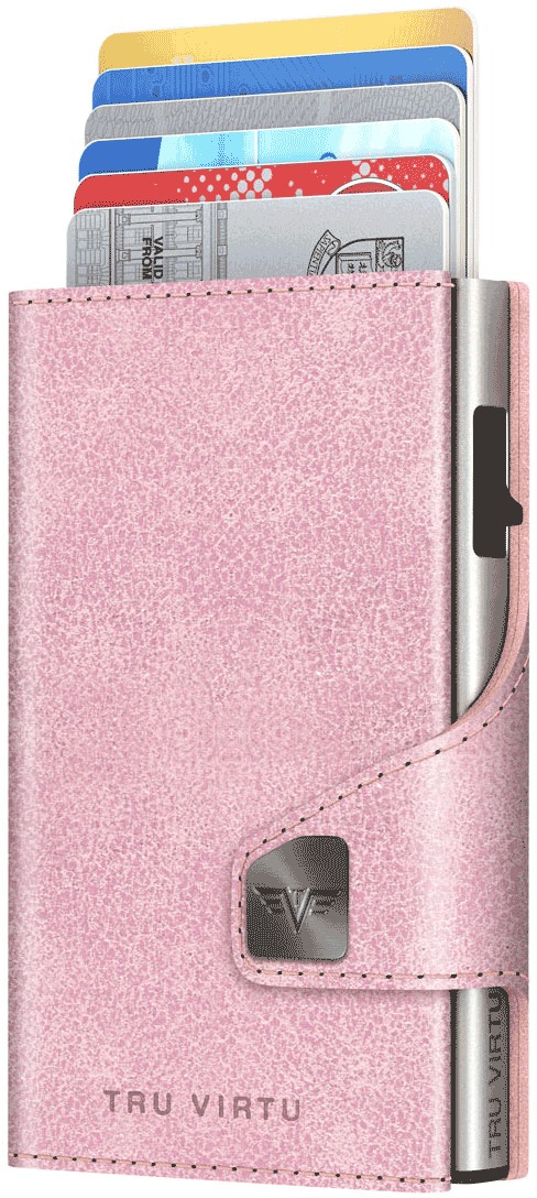 Peňaženka – dámska, kožená, s priehradkou na karty a doklady, zapínanie na patenty, chránená proti skenu kariet a kovová konštrukcia, každodenné využitie, ružová farba, rozmery 9,9 × 6,7 × 2,1 cm (V׊×D) Tru Virtu Click & Slide je luxusná peňaženka, ktorá vás oslní svojím unikátnym vzhľadom. Bola vyrobená z eloxovaného hliníka a potiahnutá kvalitnou talianskou kožou, čo vyústi do odolnosti a dlhej