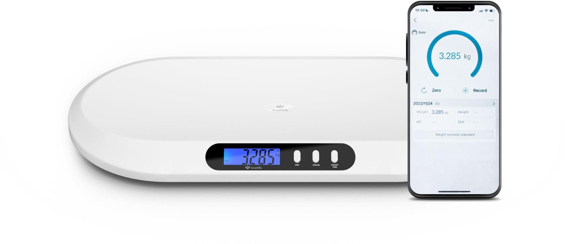 Detská váha pre deti do 20 kg, presnosť váženia 5 g, na batérie typu: AAA, funkcie: uloženie dát, párovanie s mobilnou aplikáciou, TARE a HOLD Váha TrueLife BabyScale B5 BT na prehľad o vývoji vášho bábätkaVáha TrueLife BabyScale B5 BT vám pomôže postrážiť rast a vývoj vášho dieťatka. Vyniká funkciou HOLD, vďaka ktorej je váženie oveľa presn