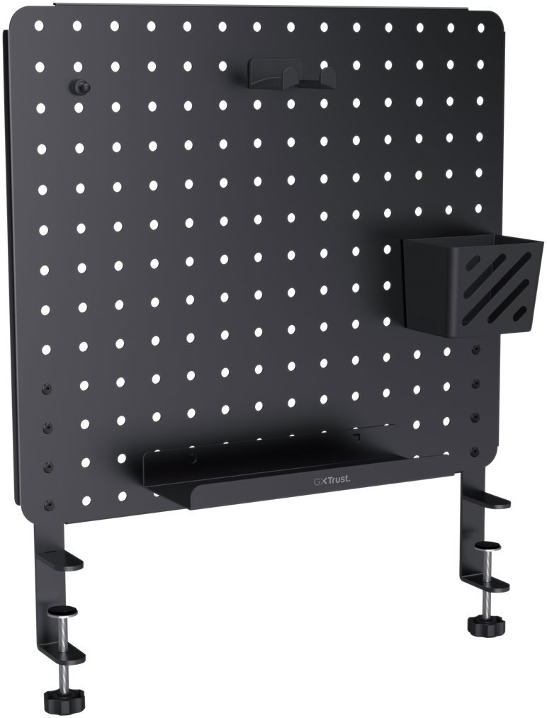 Pegboard – vertikálny aj horizontálny organizér, kompatibilný s väčšinou stolov, usadenie nad dosku stola, súčasťou balenia je držiak na slúchadlá, košík, polica a magnet, montáž bez vŕtania pomocou svoriek, rozmer 42 × 47 cm Organizér Pegboard Trust GXT 724 VESTOOrganizér Trust GXT 724 VESTO vám pomôže udržať čistý a usporiadaný herný priestor a prehľadne umiestniť napríklad káble, slúchadlá, gamepady alebo ovládače. Prie