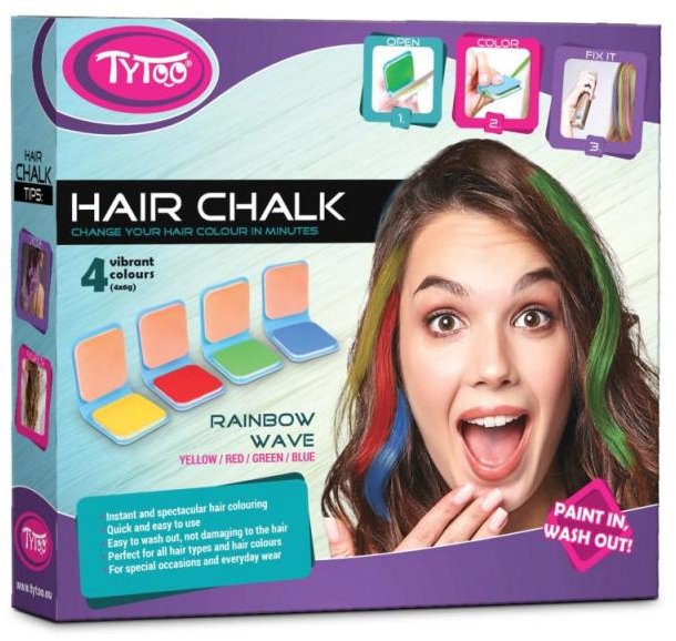 Kriedy na vlasy – vo farbách dúhy, vhodné pre deti od 3 rokov Kľúčové vlastnosti súpravy kried na vlasy TyToo RainbowKriedy v dúhových odtieňoch pre originálny a výrazný vzhľadUmožňujú dočasne zafarbiť vlasy pestrými farbamiJednoduché použitie a zmytie bežným ša