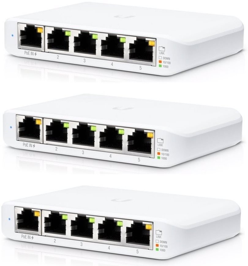 Switch firemný – desktop, centrálne riadený kontrolérom, 5× RJ-45, 1× USB 3.2 Gen 1 (USB 3.0), DHCP, PoE, VLAN, podporuje 802.3af (PoE) a 802.3at (PoE+), prepínacia kapacita 80 Gb/s, 5 portov s rýchlosťou 1 Gbit, prevádzková teplota od -5 do 45 °C, rozmery 21,17 × 107,16 × 70,15 mm (V׊×H), hmotnosť 150 g Cenovo zvýhodnené balenie trojice kompaktný smart switchov Ubiquiti UniFi Switch USW Flex Mini. Každý switch obsahuje 5 gigabitových (10 / 100 / 1 000 Mbit) portov RJ-45, z ktorých prvý môže slúžiť aj