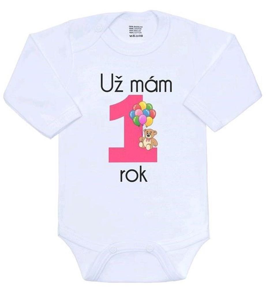 Detské body – zavinovacie, dlhé rukávy, zapínanie na cvoky, veľkosť 80, motív text, biela farba Originální bavlněné kojenecké body s dlouhým rukávem New Baby, s vtipným nápisem Už mám 1 rok a obrázkem velké jedničky…