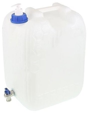 Kanister – kanister na vodu 20 l s kovovým kohútikom a zásobníkom na mydlo, biely