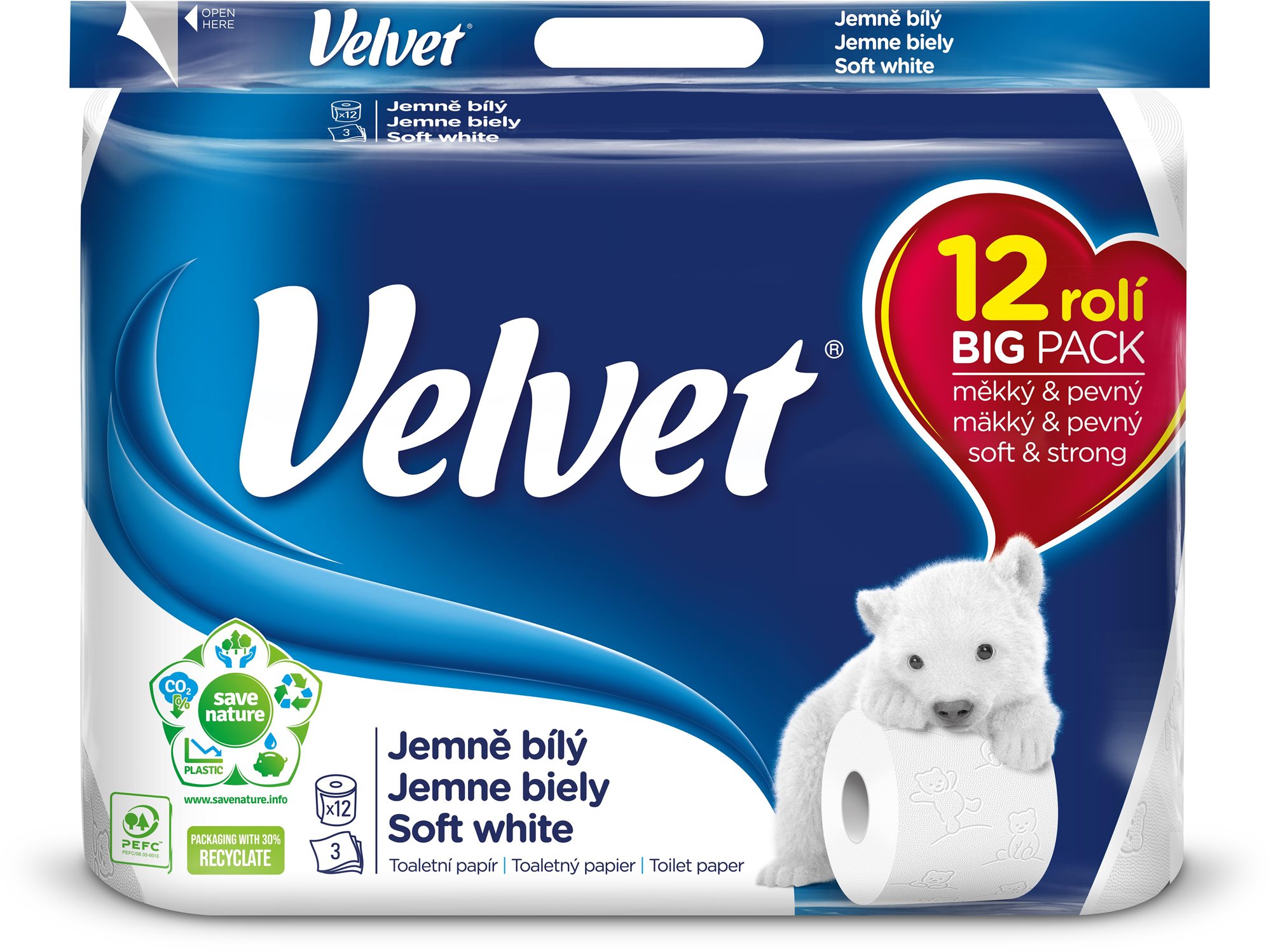 Toaletný papier – trojvrstvový, bez parfumovania, 100 % celulóza, 1800 útržkov, 12 roliek s dĺžkou 18,3 m, celková dĺžka roliek 219,6 m Toaletný papier VELVET Soft White má tri vrstvy mäkkého hodvábneho papiera s decentnou razbou s postavičkami medvedíkov. Každý útržok je optimálnou kombináciou pevnosti a jemnosti a zaručuje zamatovú
