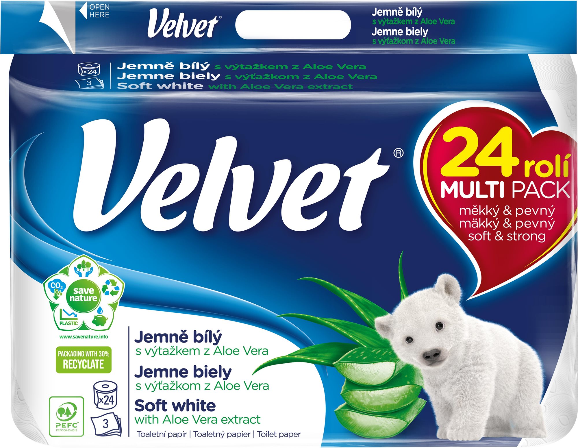 Toaletný papier – trojvrstvový, bez parfumovania, 100 % celulóza, 3600 útržkov, 24 roliek s dĺžkou 18,3 m, celková dĺžka roliek 439,2 m Toaletný papier VELVET Soft White má tri vrstvy mäkkého hodvábneho papiera s decentnou razbou s postavičkami medvedíkov. Každý útržok je optimálnou kombináciou pevnosti a jemnosti a zaručuje zamatovú