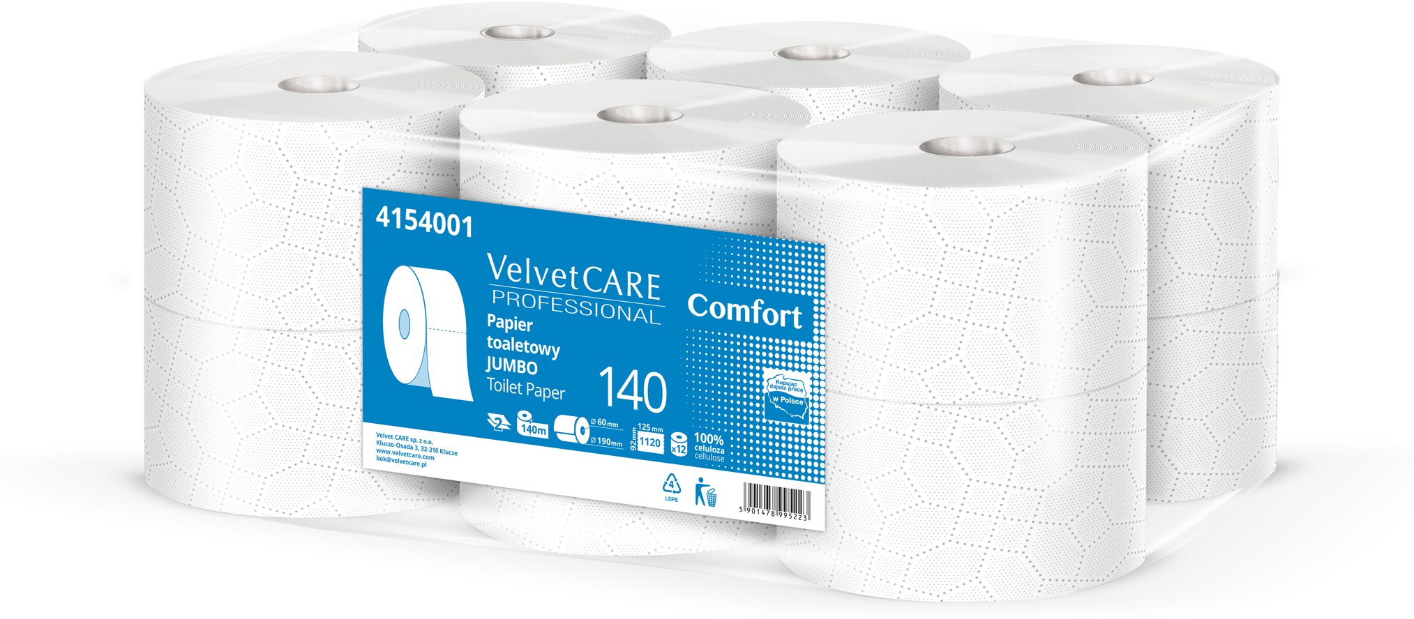 Toaletný papier – dvojvrstvový, bez parfumovania, ekologický a 100 % celulóza, 1120 útržkov s rozmermi 12,5 × 9,2 cm, 12 roliek s dĺžkou 140 m, celková dĺžka roliek 1680 m Toaletný papier VELVETCARE Professional Comfort je vyrobený zo 100 % celulózy a tvorený dvoma vrstvami, ktoré zaisťujú kombináciu pevnosti a príjemnej mäkkosti. Materiál má jasne bielu farbu, bez parf
