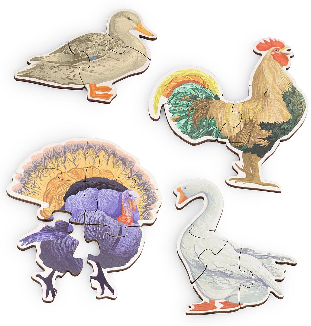 Drevené puzzle – vhodné od 2 rokov, 18 dielikov, logické a doskové, téma zvieratá Vemkel Farm birds je vzdelávacia sada pre najmenšie deti, vyrobená z kvalitného lipového dreva. Obsahuje 4 skladačky hydiny – morky, kohúta, husi a kačice. Hra so skladačkou podporuje koncentráciu aj