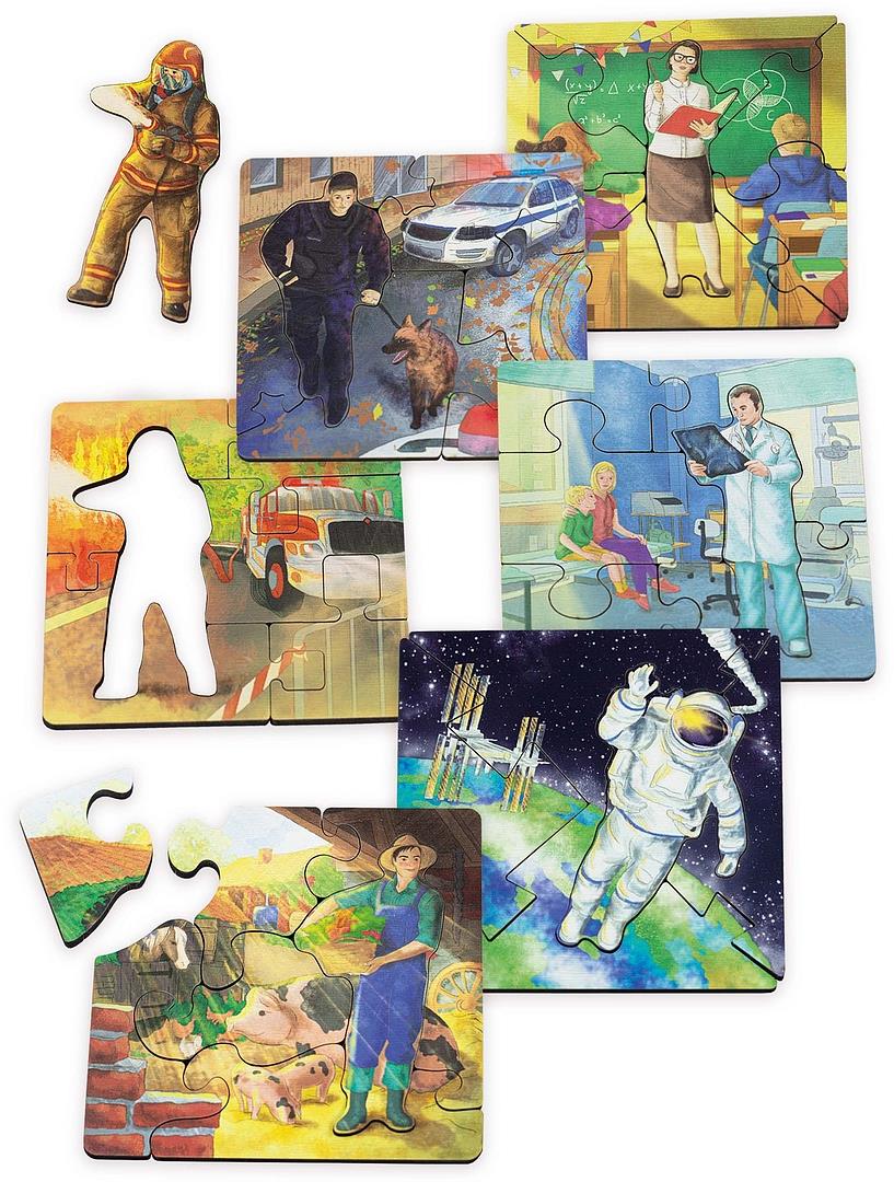 Drevené puzzle – vhodné od 3 rokov, 36 dielikov, štvorcové, téma hasiči a profesie, zostavené majú rozmery 12 × 12 cm (V׊) Vemkel Profesie je hravá vzdelávacia sada pre batoľatá a predškolákov. Obsahuje 6 štvorcových skladačiek s vyobrazením rôznych povolaní. Skladačky majú 3 stupne náročnosti a sú vyrobené z lipového dre