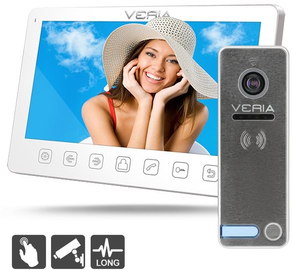 Videovrátnik veľkosť displeja 7″, uhol záberu kamery 110°, rozlíšenie videa 800 × 480 px, farebný displej, Majte prehľad o tom, kto sa pohybuje za vašimi domovými dverami. Vďaka dverovej stanici a štýlovému videotelefónu budete vedieť, kto zvoní, a či je pred domom bezpečné. Sada VERIA 7070B + VERIA 230 je