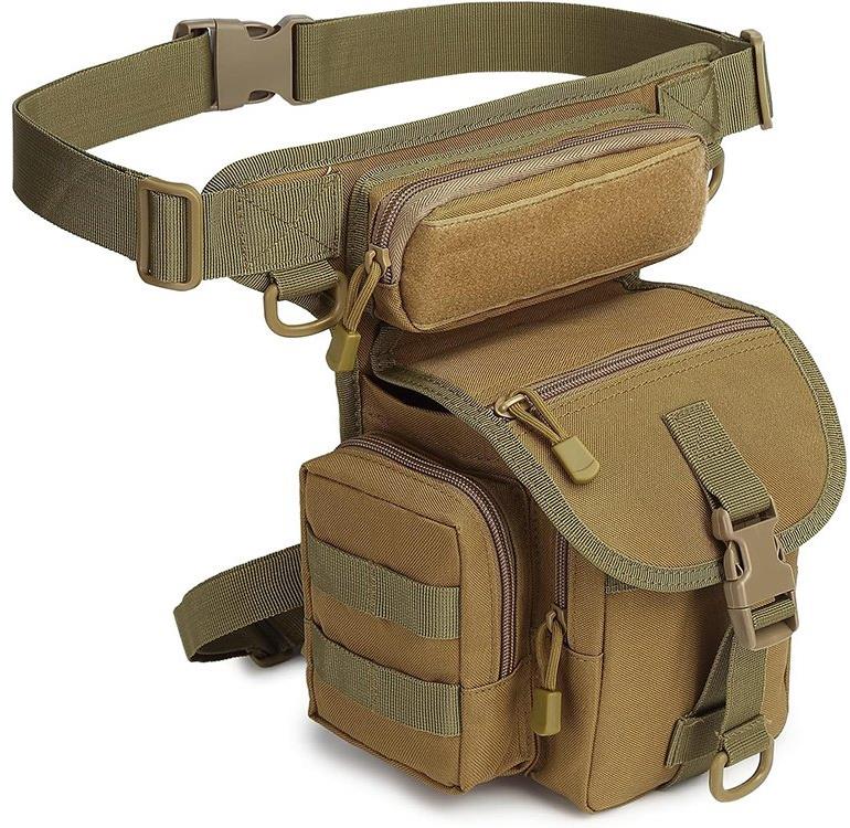 Cestovná taška – unisex, 6 vreciek, zapínanie na zips, možnosť nosenia na stehne, upínacie pásy, materiál polyester, rozmery 31 × 20 × 13 cm (V׊×H), hnedá farba Extrémne praktická a štýlová taktická taška na stehná…