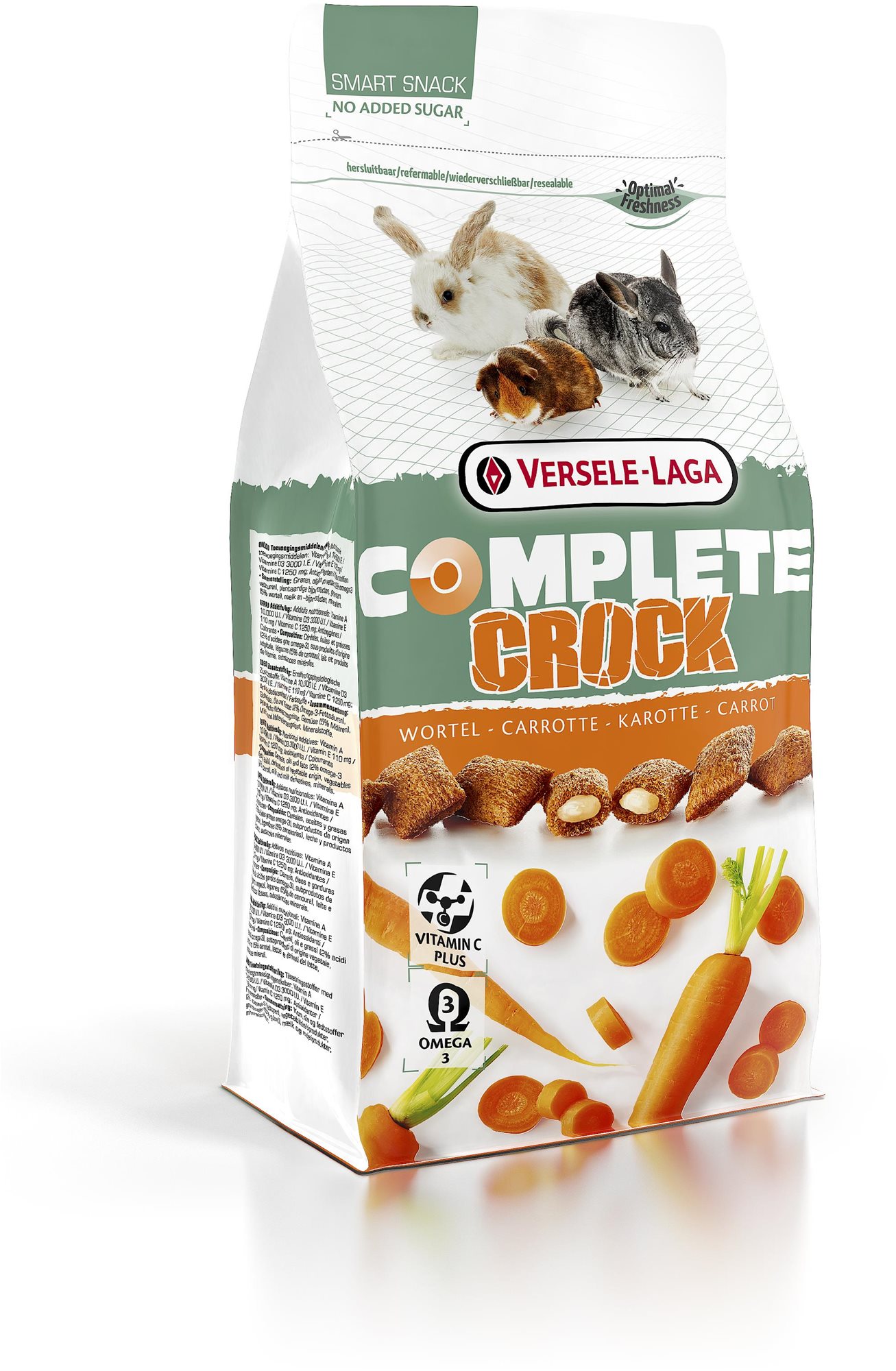 Maškrty pre hlodavce – pre činčilu, králika, morča a osmáka, vhodné pre zvieratá bez obmedzenia veku, obsahuje vitamín A, vitamín C, vitamín D a vitamín E, hmotnosť 0,05 kg Versele Laga Complete Crock Carrot je ideálnou odmenou pre králiky a drobné hlodavce. Chrumkavý obal vankúšika uspokojuje prirodzenú potrebu hlodania, zatiaľ čo mäkká mrkvová náplň ponúka nielen skvel