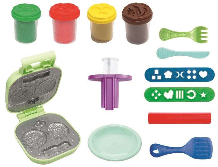 Modelína – téma potraviny, bábovky a tvorítko súčasťou balenia, zelená, červená, hnedá a žltá farba, vhodná od 3 rokov, hmotnosť 224 g, 13 kusov v balení Modelovacia hmota Veselá modelína burger prináša nielen štyri 56 g tégliky modelovacej hmoty v živých farbách, ale aj všetko potrebné na tvorbu vlastného, dokonalého modelu hamburgera. Veselá modelína