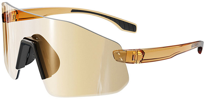 Cyklistické okuliare – unisex, rozjasňujúce, vodoodpudivé, samozatmavovacie a s REVO technológiou, zlatá farba skiel, 80 % priepustnosť, svetelná priepustnosť S0, S1 a S2, materiál skiel polykarbonát, hypoalergénny, zakrivený, pružný rám, protišmykové nožičky, bez rámu, zlatá farba rámika, mäkký nosník súčasťou, UV ochrana UV400, rozmery zorníkov 6,5 × 14,3 cm (V׊), dĺžka nožičiek 14,5 cm, šírka nosníka 2 cm, hmotnosť 23 g