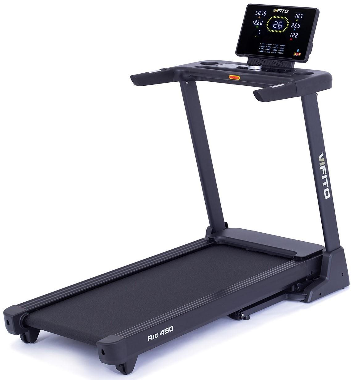Bežecký pás – motorový, skladací, rýchlosť až 18 km/h, výkon motora 2,50 HP, max. výkon 4,00 HP, elektrický náklon, max. náklon 8,53°, rozmery behacej plochy 130 × 48 cm (D׊), displej, počítač, transportné kolieska, meranie spálených kalórií, meranie tepovej frekvencie, odpružený a sklopný, 20 programov, meranie pulzu priame/zo zápästia,, nosnosť 140 kg, celkové rozmery 130 × 76 × 167 cm (V׊×H), olej/mazivo a náradie na zostavenie súčasťou balenia Vifito Rio 450 je kvalitný a veľmi skladný bežecký pás do domácnosti. Starostlivo vyvinutá konštrukcia a kvalitné odpruženie bežeckej plochy minimalizuje zaťaženie kĺbov a väzov. Pás je navyše vybaven