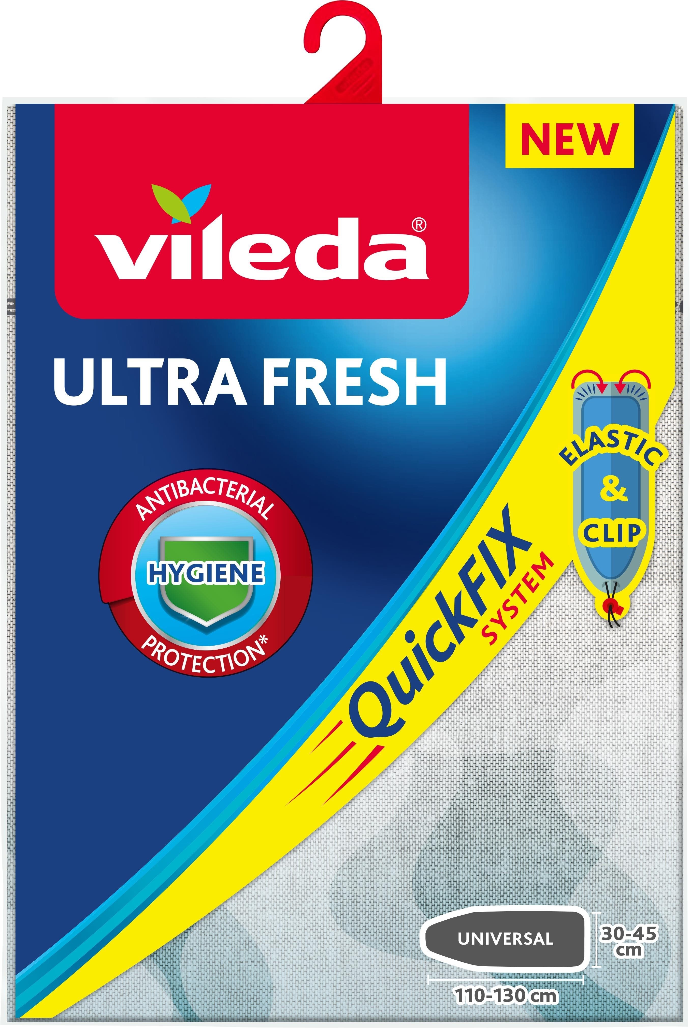 Poťah na žehliacu dosku – univerzálny, antibakteriálna zložka chlorid strieborný, inovatívny systém QuickFix, materiál 100 % bavlna, 5 mm penová výplň, vhodný pre dosky s rozmermi 30 – 45 × 110 – 130 cm Ak potrebujete doma oživiť žehliacu plochu, vyberte si poťah na žehliacu dosku VILEDA Ultra Fresh. Poťah je univerzálny, vhodný pre všetky typy dosiek. Obsahuje antibakteriálnu zložku chlorid
