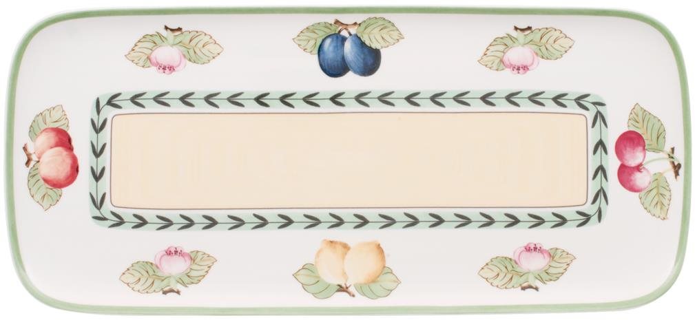 Tanier – porcelánový, vhodný do umývačky a mikrovlnnej rúry, viacfarebný, servírovací, univerzálne použitie, hranatý, retro dizajn, ovocný motív, priemer 35 cm, rozmery 1,8 × 15,8 × 34,5 cm (V׊×D), hmotnosť 600 g Kľúčové vlastnosti taniera VILLEROY & BOCH CHARM & BREAKFAST FRENCH GARDEN, 34,5 cm Tanier Villeroy & Boch nájde využitie v domácnosti aj reštauráciách Servírovací tanier uľahčí prezentáciu vašich pok