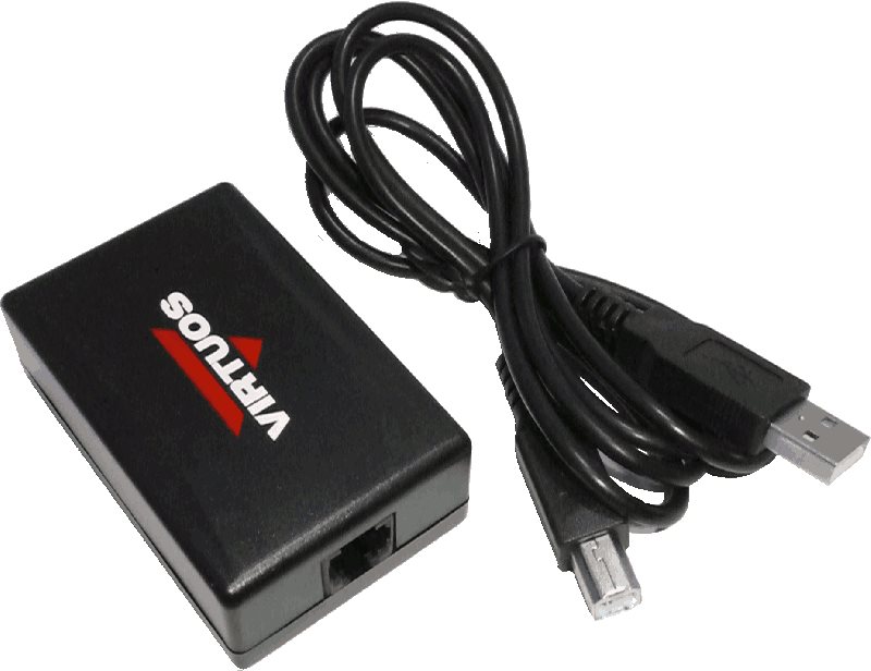 Príslušenstvo pre pokladničné zásuvky – USB adaptér na pripojenie pokladničnej zásuvky k POS systému vrátane 1.2m kábla USB adaptér Virtuos je vhodný na pripojenie 24 V pokladničnej zásuvky so šestipinovým konektorom RJ-12 k počítaču alebo POS systému cez USB konektor. Vďaka svojmu vyhotoveniu umožňu