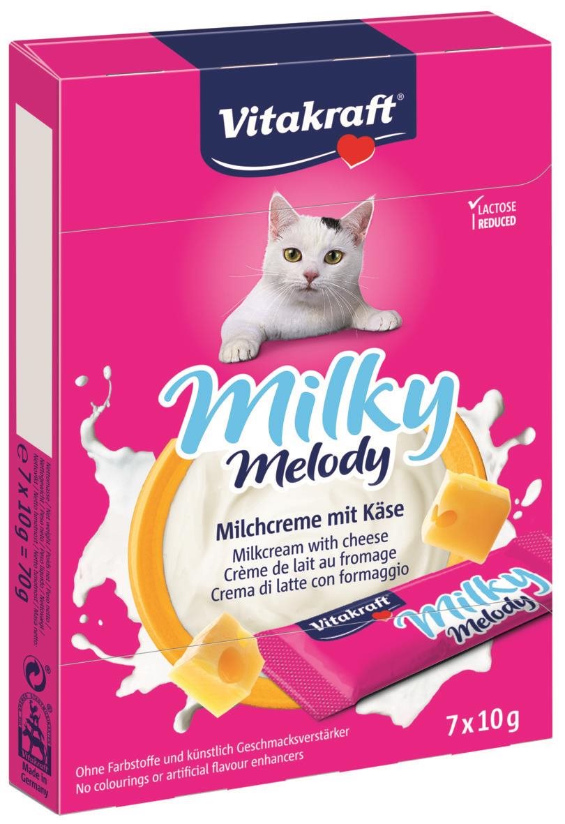 Maškrty pre mačky – na posilnenie žuvacích svalov, pre všetky plemená s normálnou aktivitou, receptúra: hydinová a kuracia, hrubé bielkoviny 2 %, tuky 9 %, bez konzervantov Mliečny krém Vitakraft Milky Melody je lahodná pochúťka pre mačky s jemnou syrovou príchuťou, ktorá kombinuje chuťovo atraktívne zloženie so zdravotnými benefitmi. Vďaka obsahu taurínu prispieva k spr