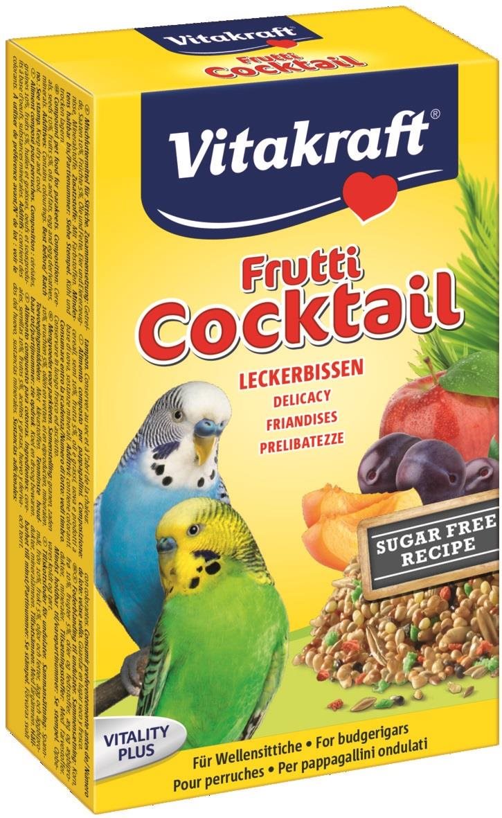 Krmivo pre vtáky – kŕmna zmes pre andulky, obsahuje vajcia, s ovocím, hmotnosť 0,2 kg, obohatené o vitamín A a vitamín D3 Vitakraft Frutti Cocktail predstavuje chutnú desiatu pre andulky. Vyvážená zmes obsahuje len kvalitné obilniny, vajcia a sladké ovocie, naopak v nej nenájdete umelé arómy ani cukor. Krmivo Frutti Cock