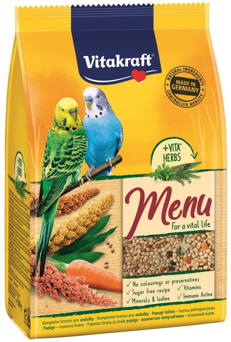 Krmivo pre vtáky – kŕmna zmes pre andulky, podporuje trávenie, hmotnosť 0,5 kg, obohatené o vitamín A a vitamín D Vitakraft Menu je kompletné krmivo pre andulky v podobe vyváženej zmesi semienok, obilnín, kúskov mrkvy a listov eukalyptu, obohatené o kombináciu cenných bylín, ako sú petržlen, skorocel a tymian. Kŕ