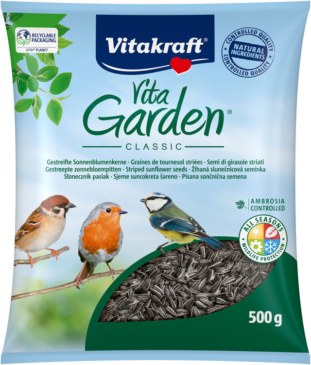 Krmivo pre vtáky – jednodruhové krmivo, žíhaná slnečnica pre vonkajšie vtáctvo, hmotnosť 0,5 kg Vitakraft Vita Garden Slnečnica páskovaná je celoročné doplnkové krmivo pre záhradné vtáctvo. Slnečnicové semená sú veľmi cenným doplnkom stravy voľne žijúcich záhradných vtákov. Narozdiel od slnečnic