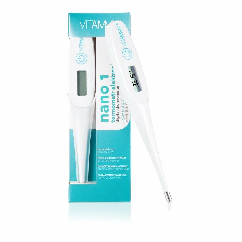 Digitálny teplomer – elektronický, s alarmom horúčky, výsledok merania za 60 sekúnd Digitálny teplomer VITAMMY NANO 1 sa postará o presné meranie telesnej teploty. Umožňuje meranie teploty v ústach, podpazuší aj konečníku. Veľmi ľahko sa obsluhuje a poskytuje presné meranie s odchýlk
