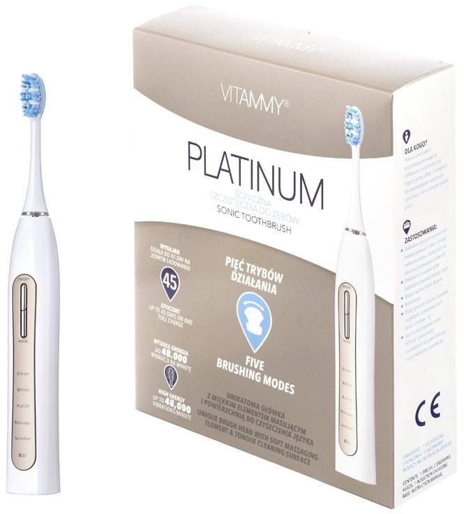 Elektrická zubná kefka – sonická, 96000 pohybov za minútu, 5 režimov, časovač a indikátor batérie, v balení 2 hlavice VITAMMY PLATINUM s piatimi funkciami je klasická štýlová sonická zubná kefka s ušľachtilým povrchom vo farbe šampanského zlata. Vyrobená je z pevného materiálu a bude vám slúžiť niekoľko rokov. Je dok